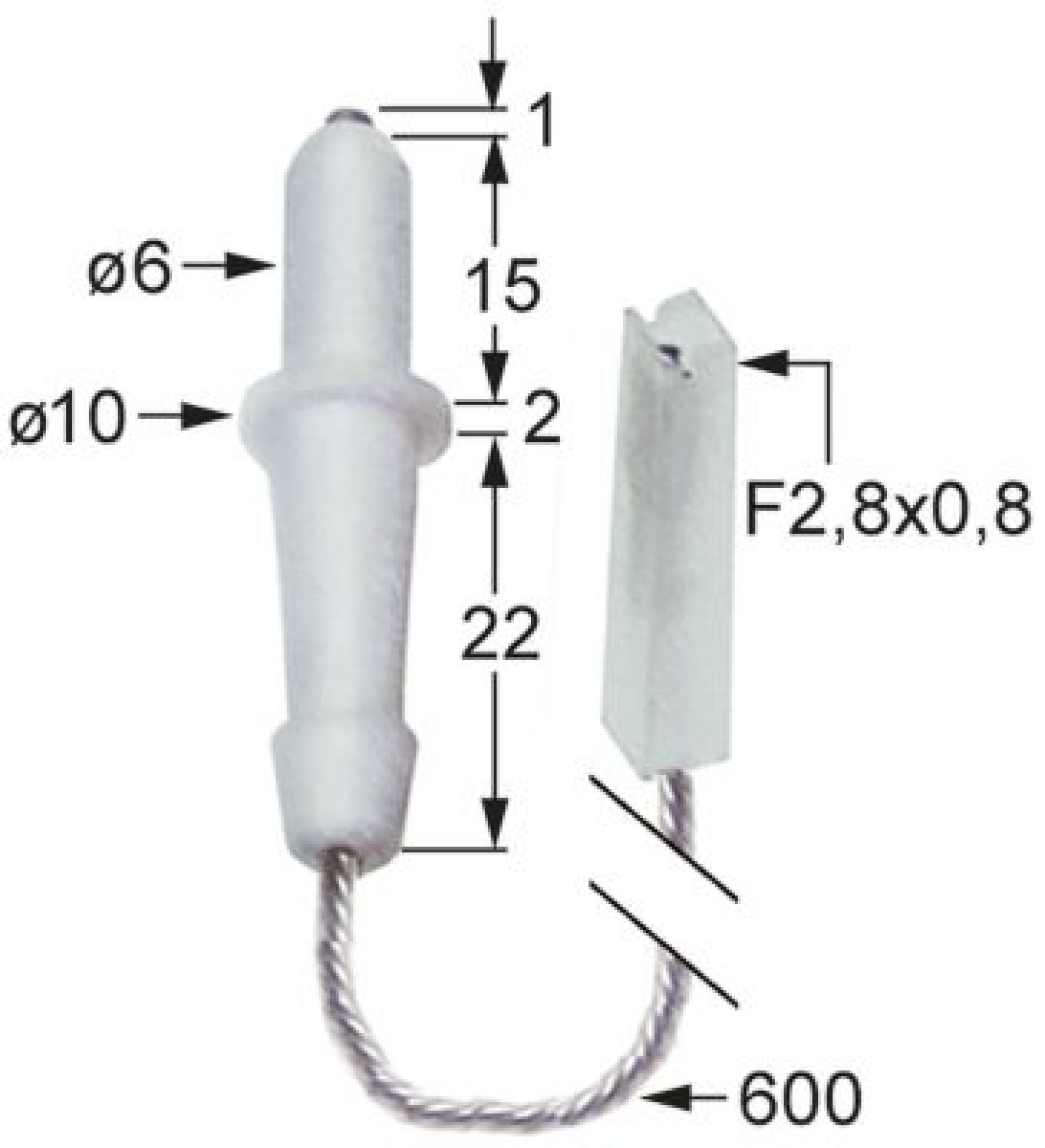 Zapalovací elektroda L1 1mm k uchycení přípojka F 2,8x0,8mm délka kabelu 600mm D1 ø 6mm